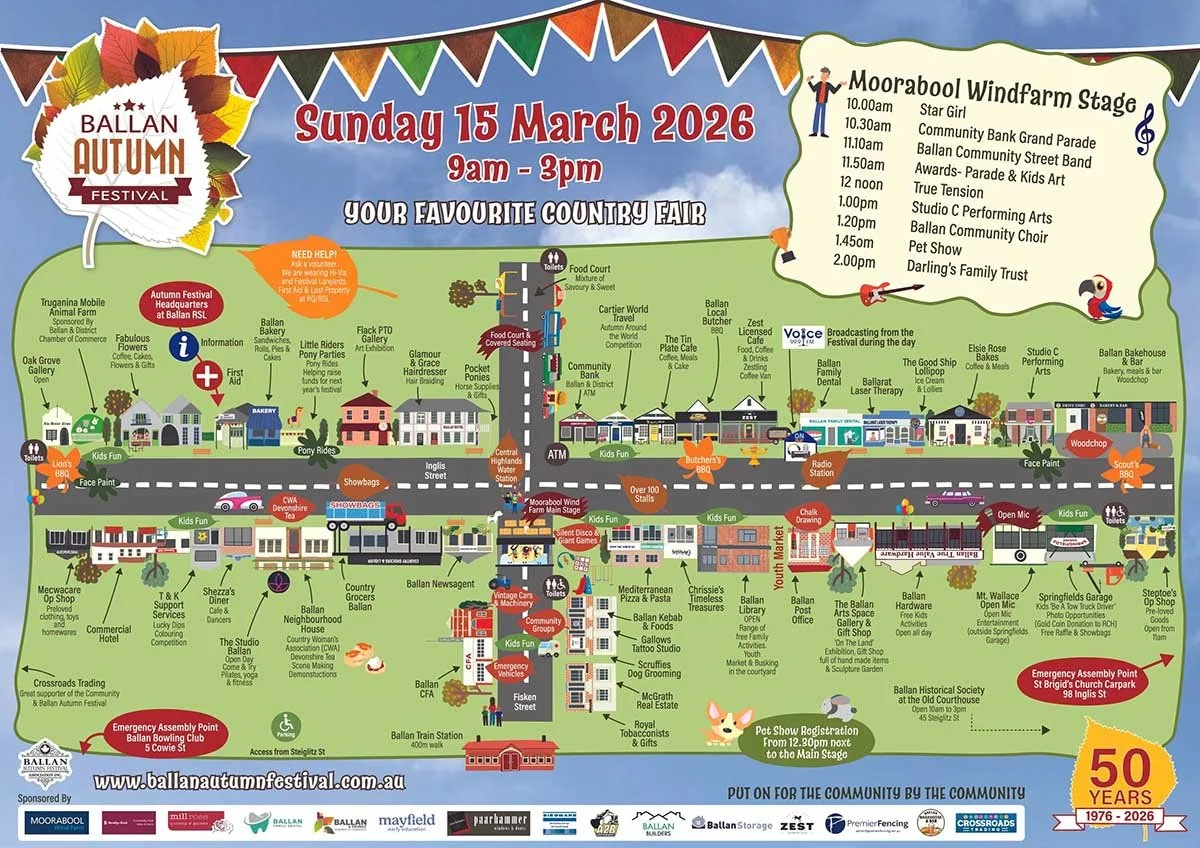 Live music on the day will come from The Darlings Family Trust, True Tension, Jayden Spence, Woodmans Hill Band, Creswick Brass Band, Ballan Street Band, Kyneton Street Band and Ballan Community Choir.
