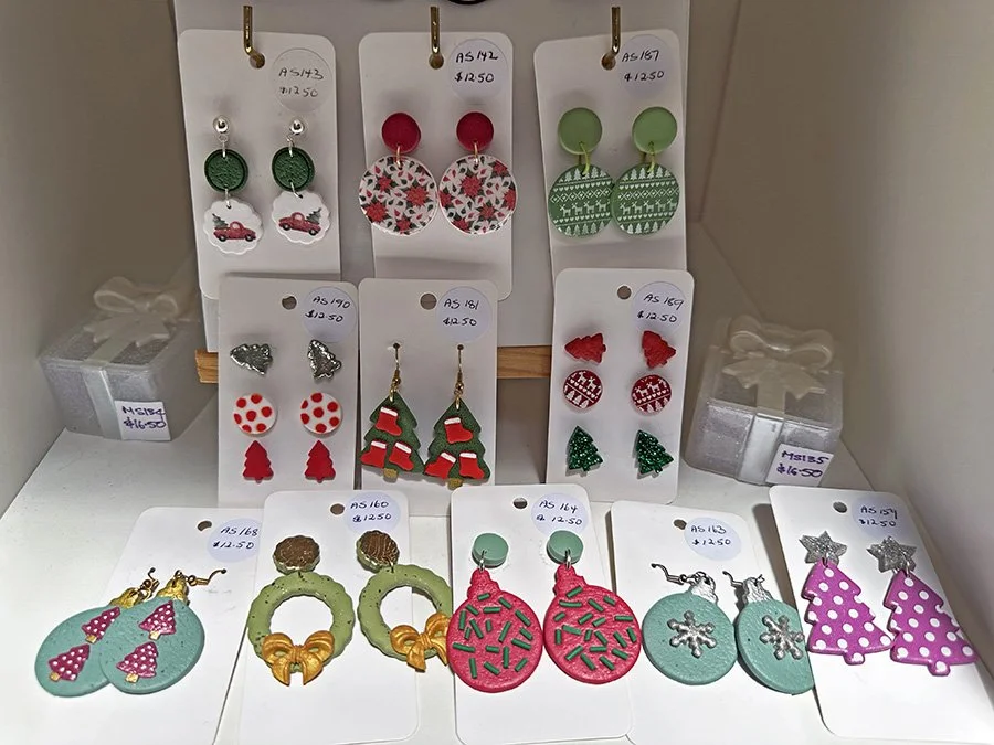 In the shop you will find Christmas earrings and handmade and decorated stockings sculpture, ceramics, journals, gift cards and more.