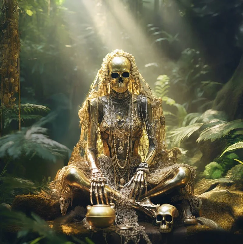 This breathtaking, adorned golden skeletal Madonna with light streaming through the lush foliage of a rainforest is part of Heidi Bones’ Icons + Bones, which can be viewed at Bacchus Marsh Village Green until September 30.